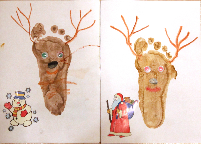 Самый большой восторг дочка испытывала во время покраски своей ноги. И до сих пор спрашивает меня будем ли мы еще ноги красить. Идею открытки я ей заранее не говорила, поэтому когда отпечаток ее ножки ожил и превратился в оленя - очень обрадовалась. Потом я ей выдала лист с наклейками и она еще наклейки клеила самостоятельно - украшала открытку. Кстати, наклейки можно было положить в адевент, но тогда бы они воспринимались как подарок, а когда я ей их выдала как данность, то это воспринимается как данность - как будто мама дала просто цветную бумагу для поделок. И лишнего ажиотажа вокруг подарков не происходит.