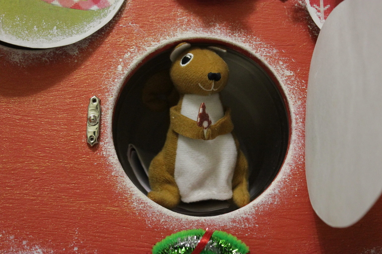 К пятнице (!) дочка уже втянулась и поняла всю эту игру в адевент - прямо с утра пошла к домику проверять кто же к ней пришел в этот раз. А в пятницу к ней прискакала белочка из лесу с заданием раскрасить игрушки из соленого теста, которые мы делали во второй день адвента. Духовка (2 часа при 50 градусах и еще 40 минут при 100 градусах) и воздух уже просушили игрушки достаточно для того, чтобы их можно было раскрашивать.