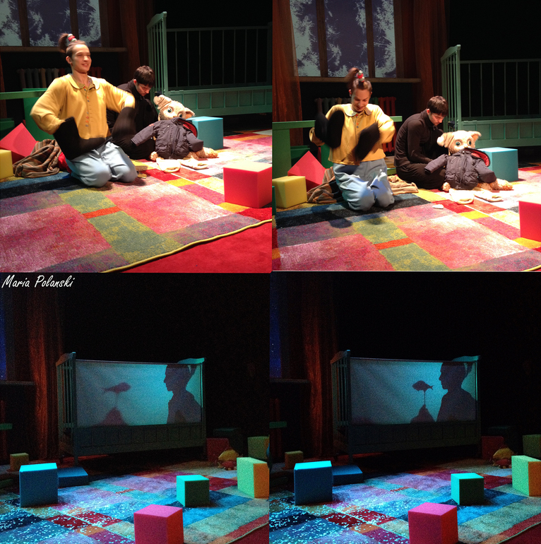 Сам спектакль по сюжету вроде бы ни о чем, просто обычный детский день, который начинается утром и заканчивает вечером одновременно с окончанием спектакля. Всего два действующих лица - малыш и кот (которым управляет кукловод), и "голос за сценой", комментирующий действия. Но тут суть даже не в сюжете, (что и очень удивительно, ведь обычно как раз наоборот!), а в философии бытия. Я долго думала, для кого этот спектакль: для детей или для взрослых и так и не пришла к ответу. Спектакль про ребенка и на том уровне, который понятен ребенку. Не в том примитивном смысле, который мы вкладываем, когда взрослые что-то делают попроще и попонятнее, а как раз в глубоком, совершенно ином понимании мира. Для детей этот Малыш свой, он видит мир так же как они, и тут не нужен никакой сюжет, тут важны ощущения, образы. А родители во-первых получают возможность остановиться и увидеть мир глазами ребенка, вспомнить, что когда-то они сами именно так видели мир, и может быть начать это чуть больше ценить и чуть лучше понимать своего собственного ребенка. Спектакль простой, но при этом философский и глубокий. Он необычный, поэтому не могу сказать, что советую всем. Он далеко не каждому понравится, его надо не только увидеть, его надо прожить и прочувствовать.