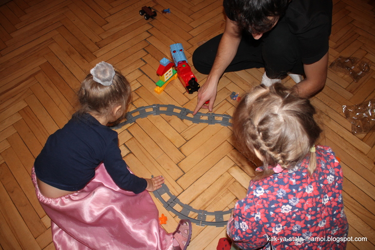 И еще такой момент, который принес нашей семье некоторое облегчение. Поезд девочкам настолько сильно понравился, что они даже спокойно в него могли играть в утреннее время часа 2. Уж не знаю, что они там с ним делали, потому что мы, наконец, за последние 4 с половиной года, не подскакивали с кровати в 7 утра (самое позднее) и шли на кухню варить кашу, а СПАЛИ СПОКОЙНО в кровати.