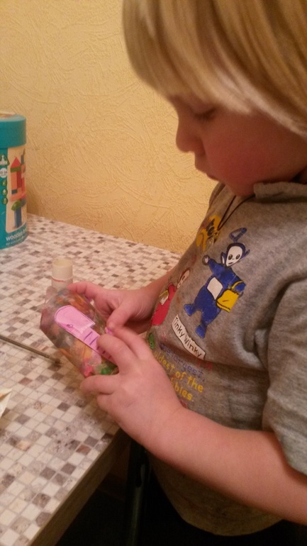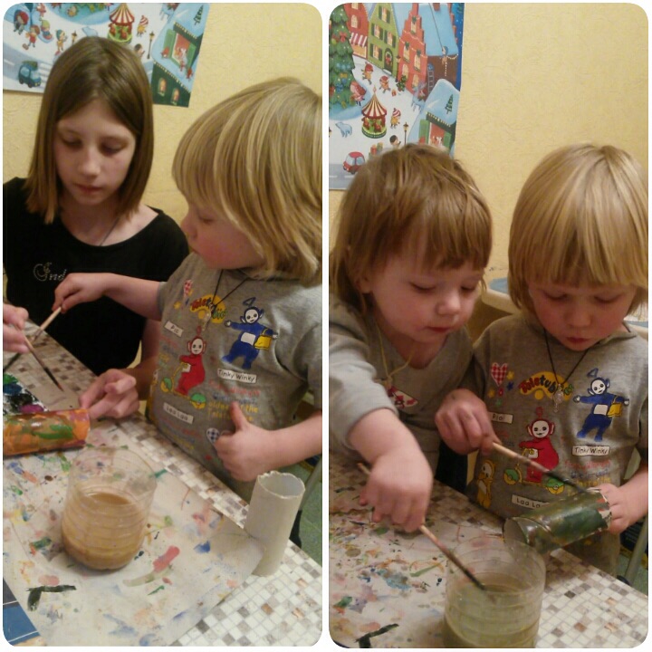 Работа была коллективная. Вспомнился мультик, где дядя федор пишет письмо родителям по очереди с Матроскиным и Шариком. Также и у нас. Коля начал, пришла Люба: " Что это ты тут делаешь? Я тоже хочу". Добавила от себя. Потом Олечка решила тоже оставить свой красочный след. Присоединилась.