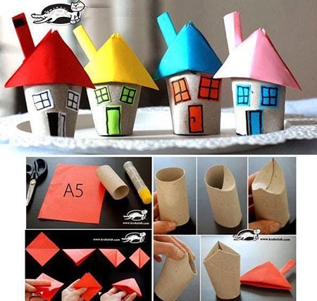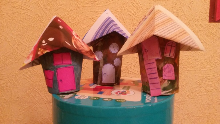 Потом приклеили дверки и окошки. Я выдала уже сложенные крыши, их тоже приклеили.