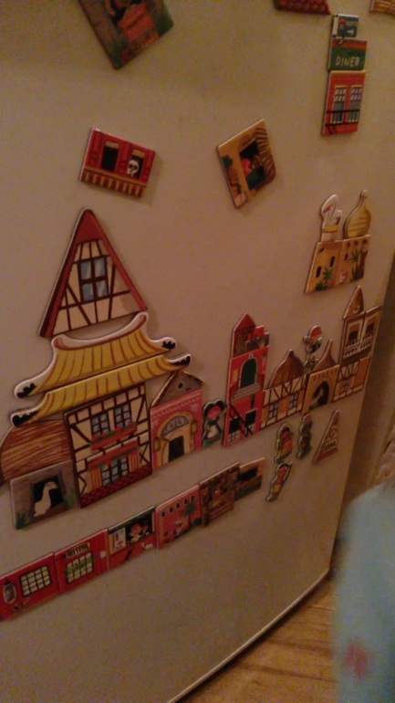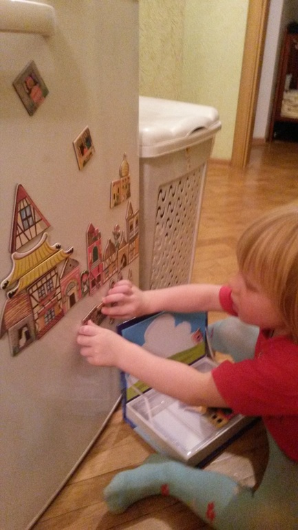 Картинку нужно собирать на крышке от коробки, но ( пока Коля не очень заинтересовался, как складывать по образцу) и поэтому мы облюбовали для этой цели холодильник. Выстраиваем на нем сразу целый город, применяя все магниты . Так ему ( пока) больше нравится.