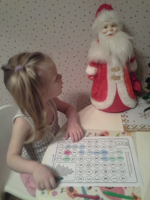 Немножко заданий поделали. Здесь, например, дорожку из буквы "ё" к ёлке прокладываем. Такие лабиринты на каждую букву можно скачать на grow-clever.ru
