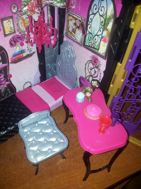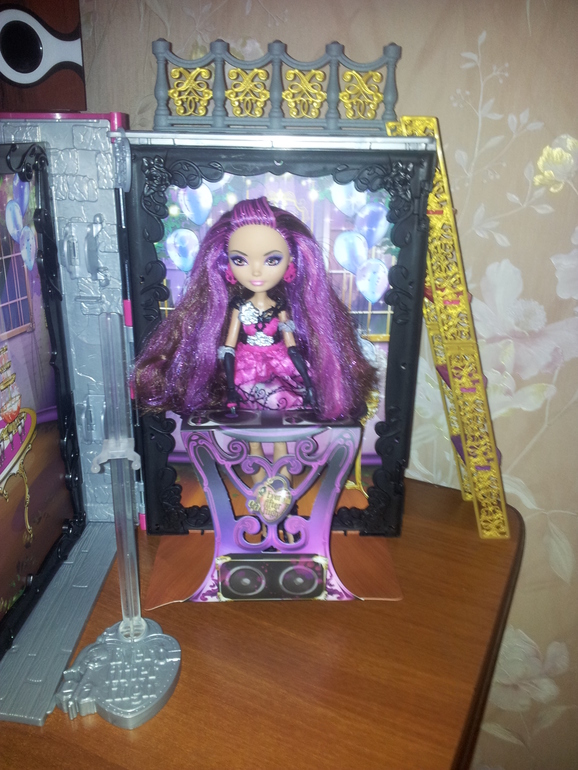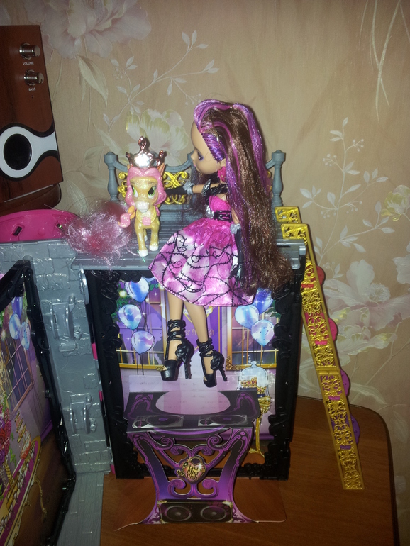 Из аксессуаров входит зеркало,золотая расческа(из другого набора),кекс,торт,кубок,стакан,вешалка для вещей и маска