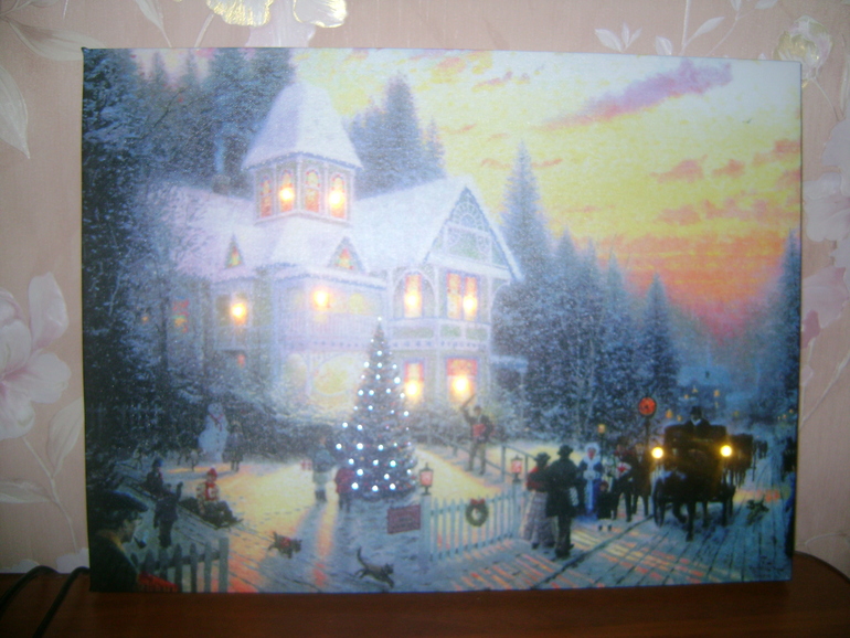 Подарочек картина с подсветкой-горят фары автомобиля,окна домов и ёлка разными огнями