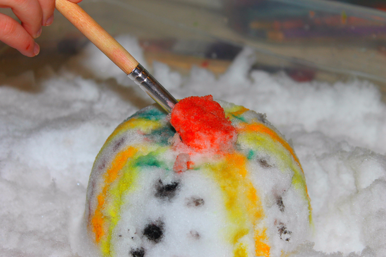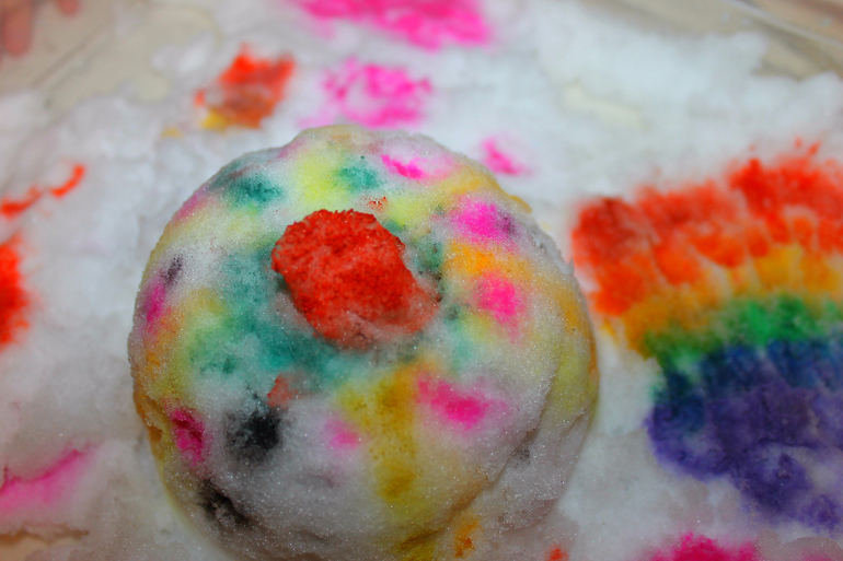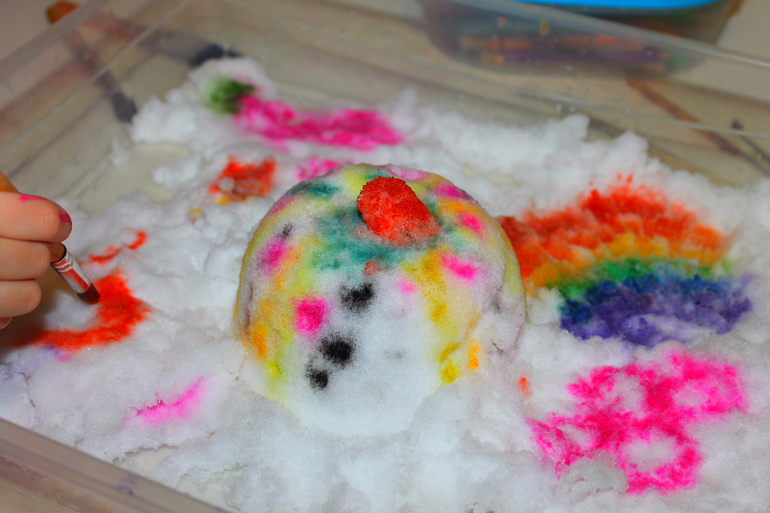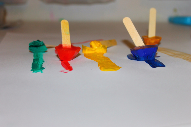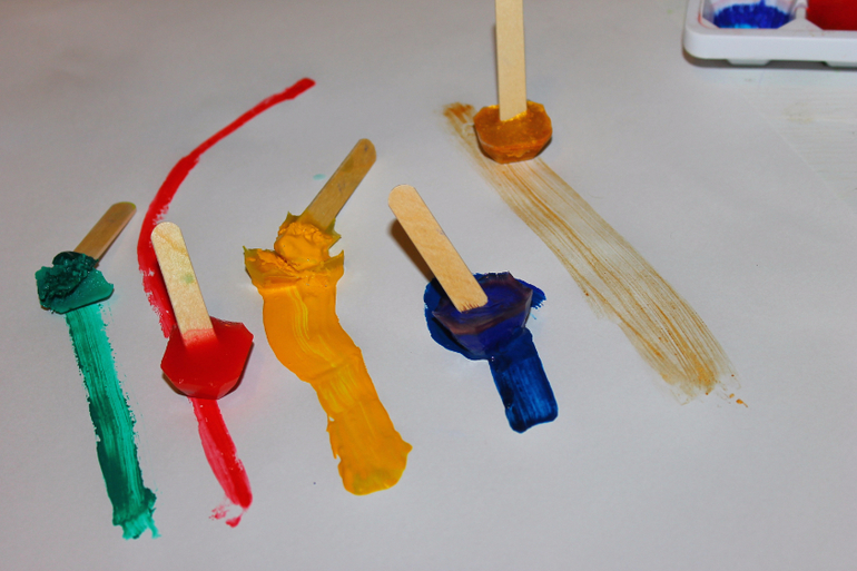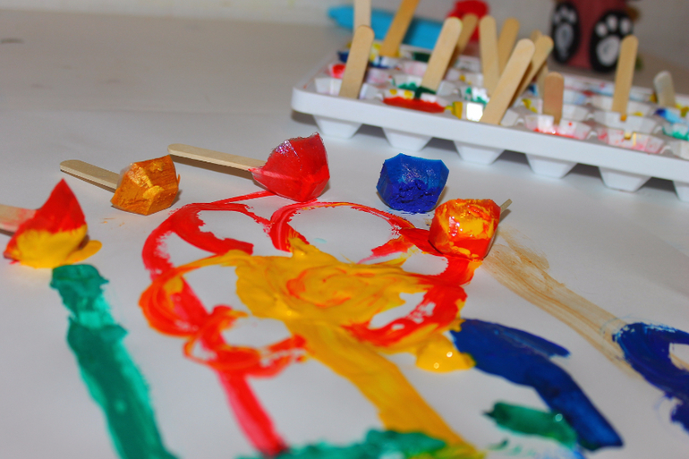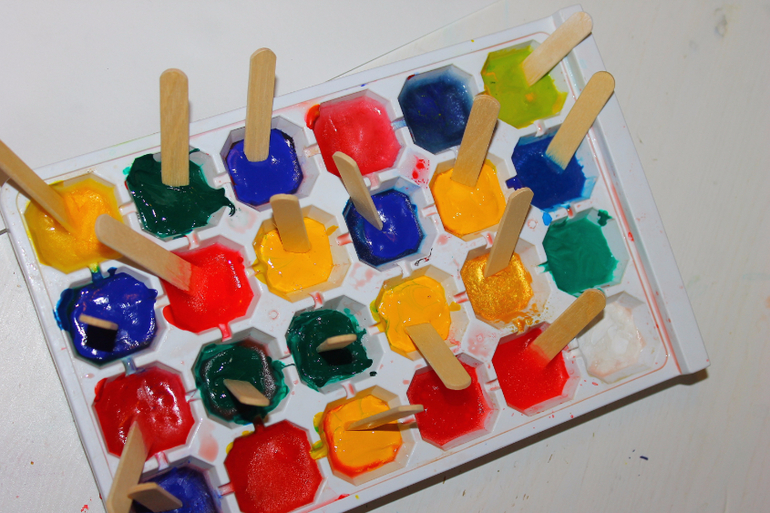 10. Рисование льдом. В формочках для льда заморозили краску, с палочками. У нас была гуашь и гуашь+вода.Гуашь замерзает дольше,тает быстрее и рисовать ею сложнее т.к. она тает вся и сразу, а вот гуашь+вода и замерзает быстрее и рисовать ею интереснее и дольше.