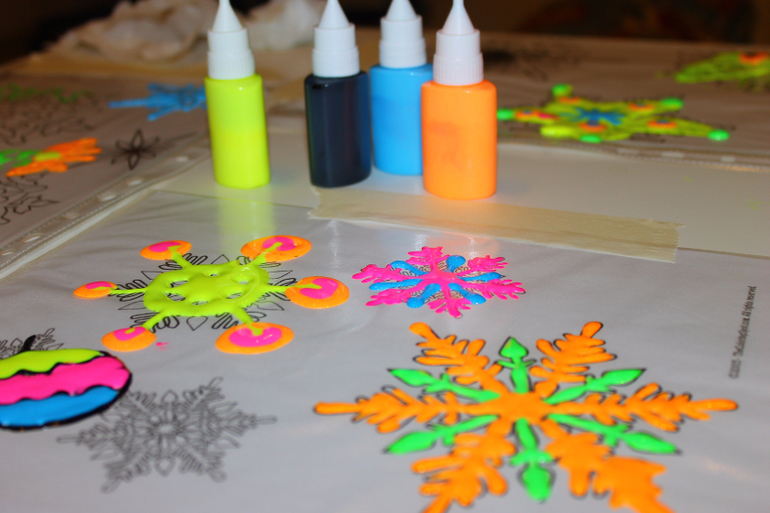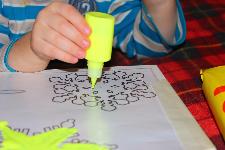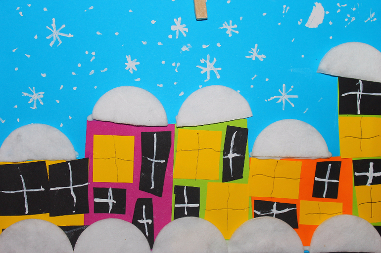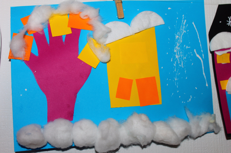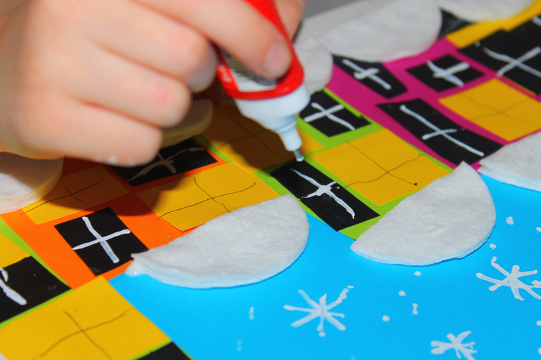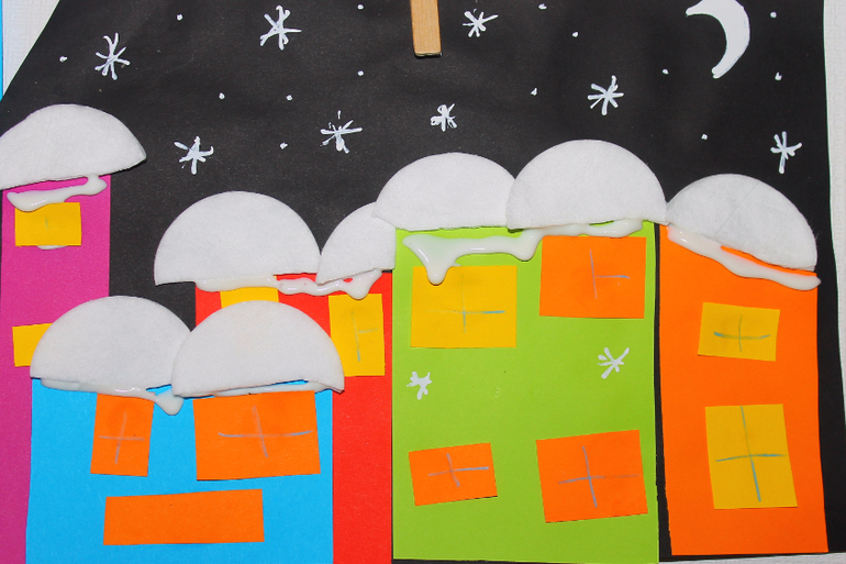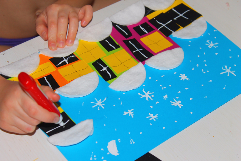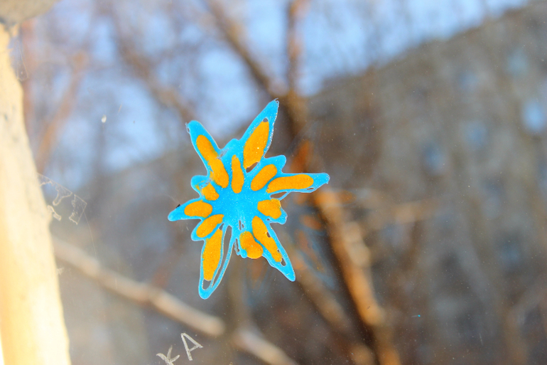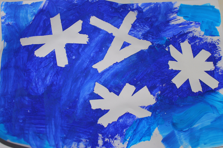 1. Малярным скотчем произвольно наклеили снежинки и закрасили лист. Затем оторвали скотч и получилась такая снежная прелесть.