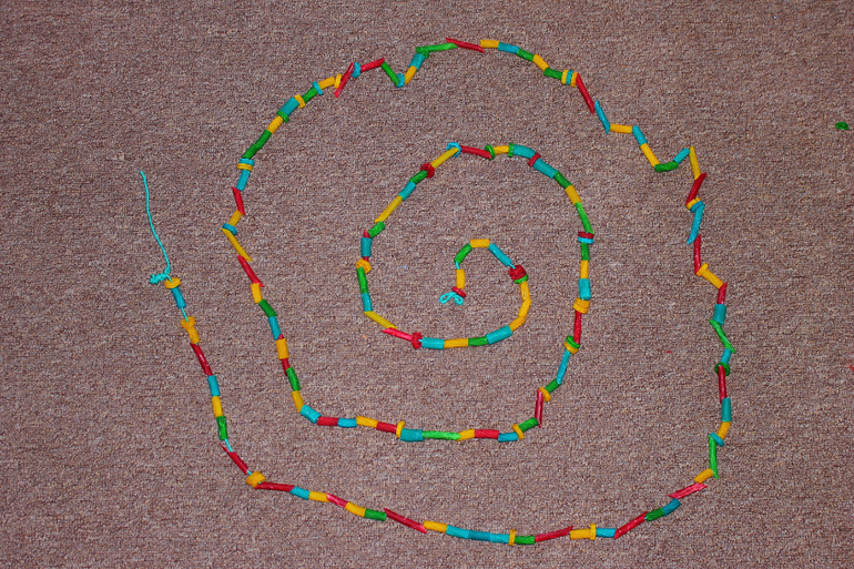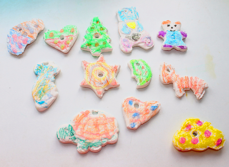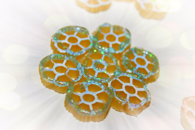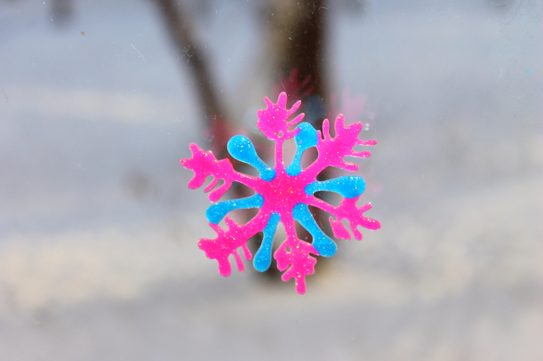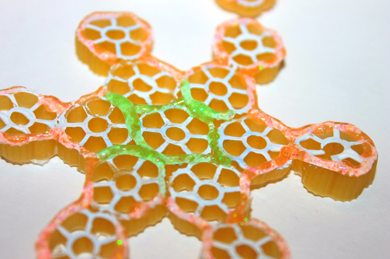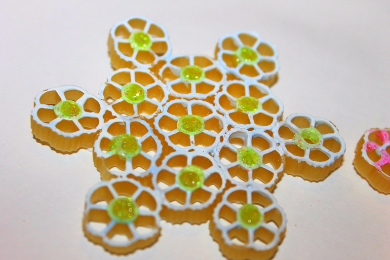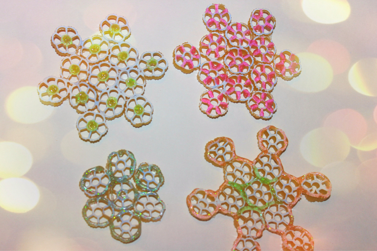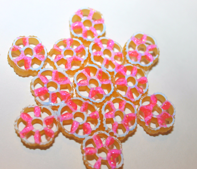 11. Снежинки из макарон. Такая вот клееная и раскрашенная красотища.