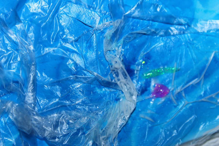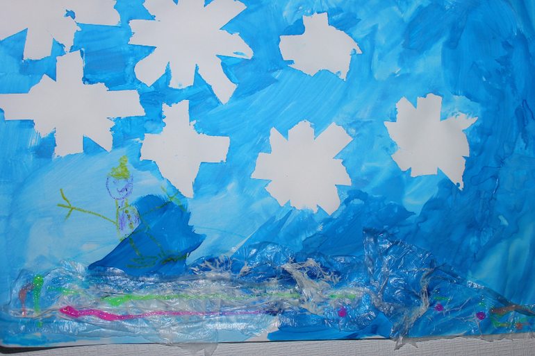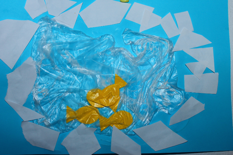 2. Полиэтиленовые пакеты приклеивали на бумагу,сминая руками. Получалась , покрытая льдом вода- океан, озеро, пруд.