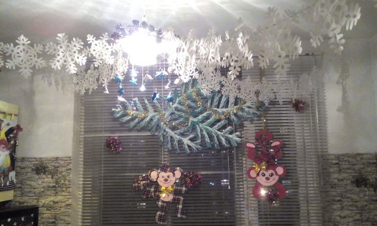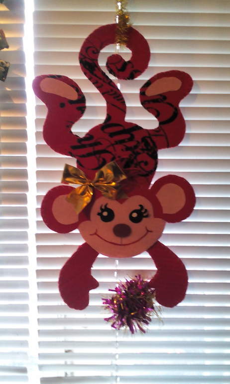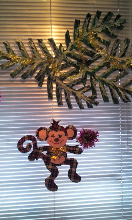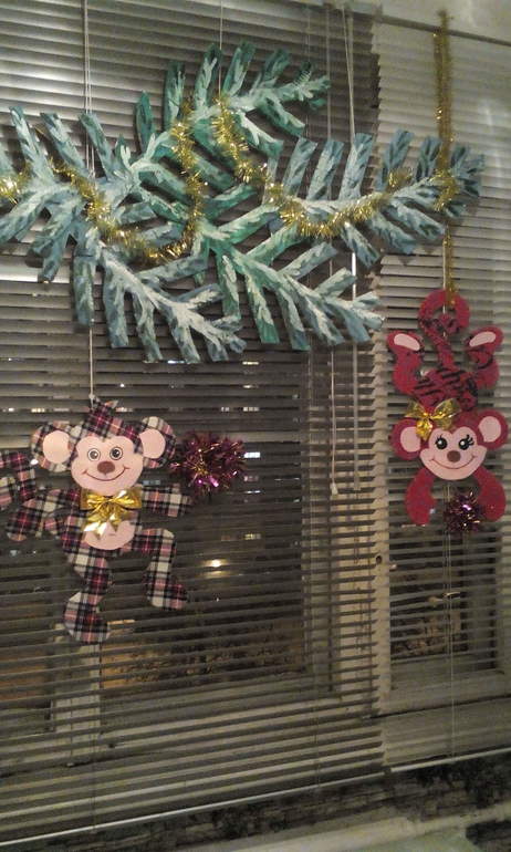 Вот и наступил Новый 2016 год!Ждали,готовились....Постепенно появлялась на кухне праздничная композиция,посвящённая главной виновнице торжества-Огненной обезьяне. Такая парочка мартышек украшает окно.Забавные,весёлые мордашки,ветви ели чем-то пальмовые напоминают .С праздником,девочки.Удачи,здоровья в Новом 2016 году!