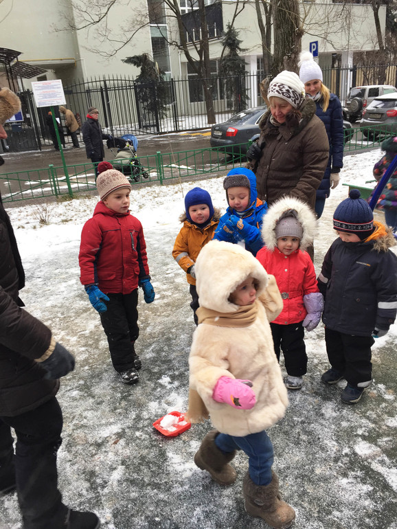 И вот все собрались и первый конкурс - накорми снежками оленя. Деткам обозначили линию, за которую заступать нельзя и они начали по очереди кидать в рот оленю свои снежки.