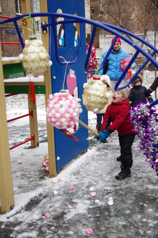 Площадку под праздник мы переделали заранее. Повесили пиньяты, разместили ключи для квеста, сделали из горки рождественского оленя, расставили реквизит. Хотели сделать намного больше, но на морозе скотч отказался клеить! В итоге потеряли много времени, а сделали только минимально необходимое. (учтем на будущее такой риск)