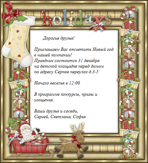 Праздник к нам пришел (Игры в День Рожденья, Новый год, 8 марта и.т.д.. А так же чем занять нескольС Новым годом дорогие ббшечки! Решила поделиться с вами, нашей историей празднования Нового года чтобы и друзей было много, и скучно не было, и детский режим не трогать. Как и большинство семей, мы заранее стали задаваться вопросом что делать на праздник. Подумав, мы с мужем решили сделать подарок не только своему ребенку, но ее друзьям, и нашим хорошим соседям. Вот мы и организовали 31го декабря небольшой междусобойчик на детской площадке. Возраст маленьких участников составил от 2,8 до 5,5 лет (младенцев в колясках мы не считаем). Итак, недели за две Софа всем своим друзьям раздала вот такие приглашения