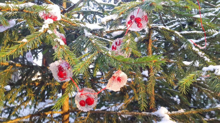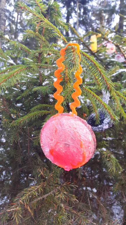 Игры и игрушки от 0 до 99 (Про игры и игрушки которые подойдут и большим и маленьким)Многие наверное делали ледовые игрушки на елку! Мы опробовали свою версию с ягодами клюквы, а вторую с покраской воды акварелью и цветными ниточками. Замораживали все ночью на балконе, тк морозилка у нас занята ягодами с лета! Получилось здорово, и мы украсили елочку в лесу во дворе! Пробуйте, это совсем не затратно и весело!