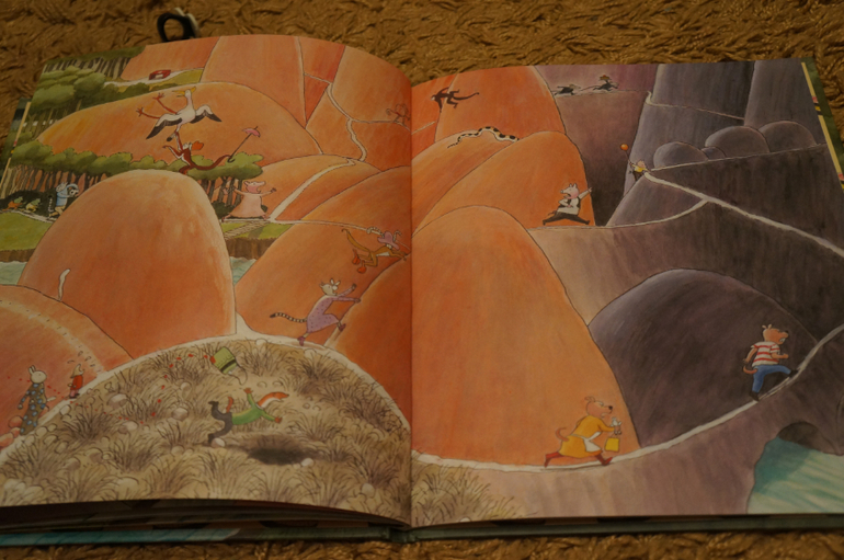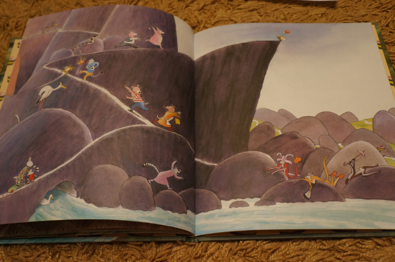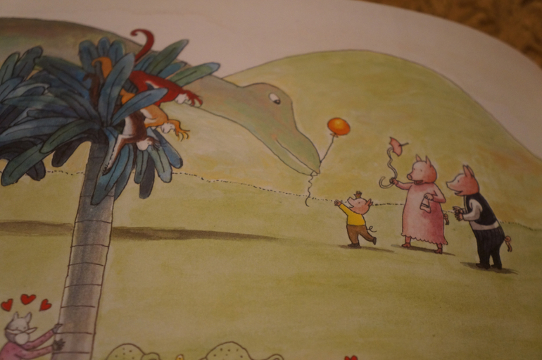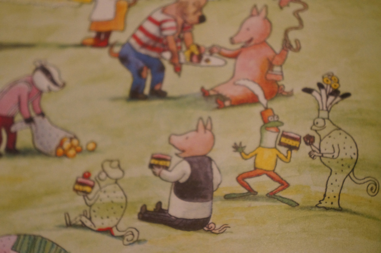 Каждый раз можно прочитывать эту книгу по-разному. Крысы стащили торт и собаки преследуют воришек ,обезьяны стащили шляпку у кошки, у малыша поросенка улетел воздушный шарик, а крольчонок потерял свою любимую игрушку и плачет, лягушки играют в мяч и случайно попадают кому-то по голове, кто-то красит стол. а влюбленный хамелеон собирает ромашки для своей дамы... и еще много-много событий для составления разных историй. Это огромный простор для развития фантазии и воображения.