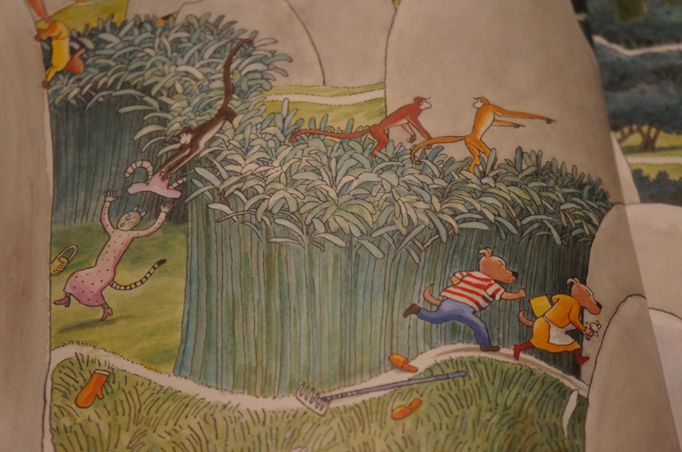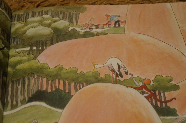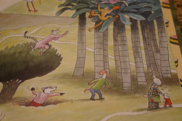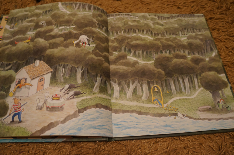 Спокойные иллюстрации, крупные герои. Есть более десятка главных героев, которые сопровождают нас на каждой странице до конца книги. У каждого из них своя история, свое занятие. Есть страницы где и не сразу найдешь кого-то из героев, то спрятался за деревом, то в кустах, только хвостик или что-то еще выдает их присутствие.