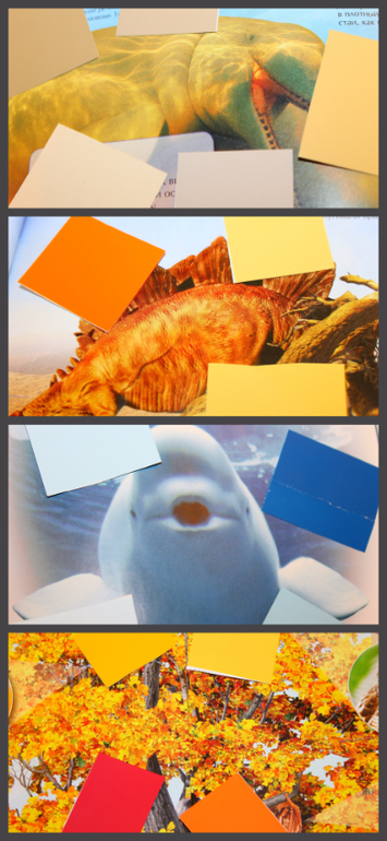 6. В красочных фото, картинах искать нужные оттенки,прикладывая карточки.