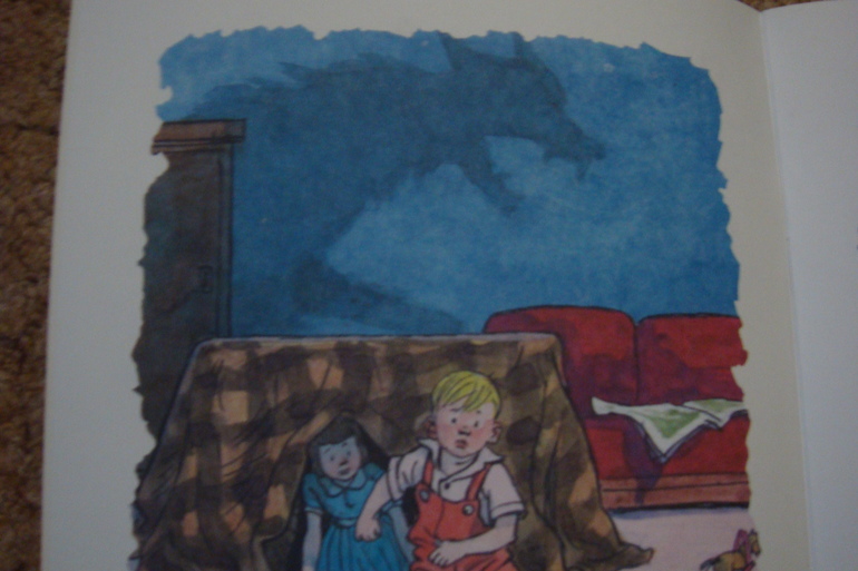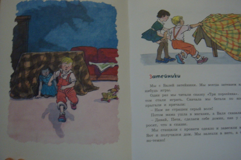 Следующим рассказом который мы прочитали был "ЗАТЕЙНИКИ" История вполне подходит для нашего возраста. Там мальчик и девочка играли в Три поросенка и построили домик при помощи покрывала и стола.