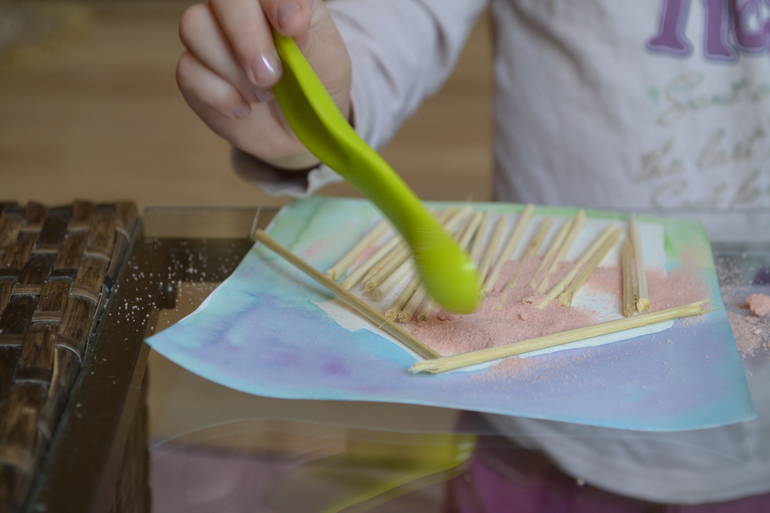 Брусочками для постройки домика стали палочки для шашлыка, поломанные на три части. С помощью двухстороннего скотча я сделала примитивный шаблон домика, и малыши обклеивали его деревяшками. Оставшиеся липкие щели засыпали цветным самодельным песком.