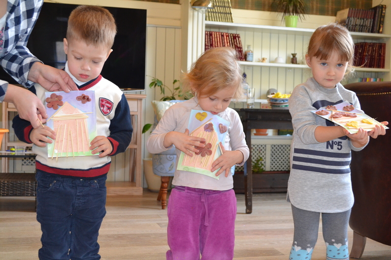 А потом еще принесли свои поделки-домики и их тоже украсили пластилином :-)