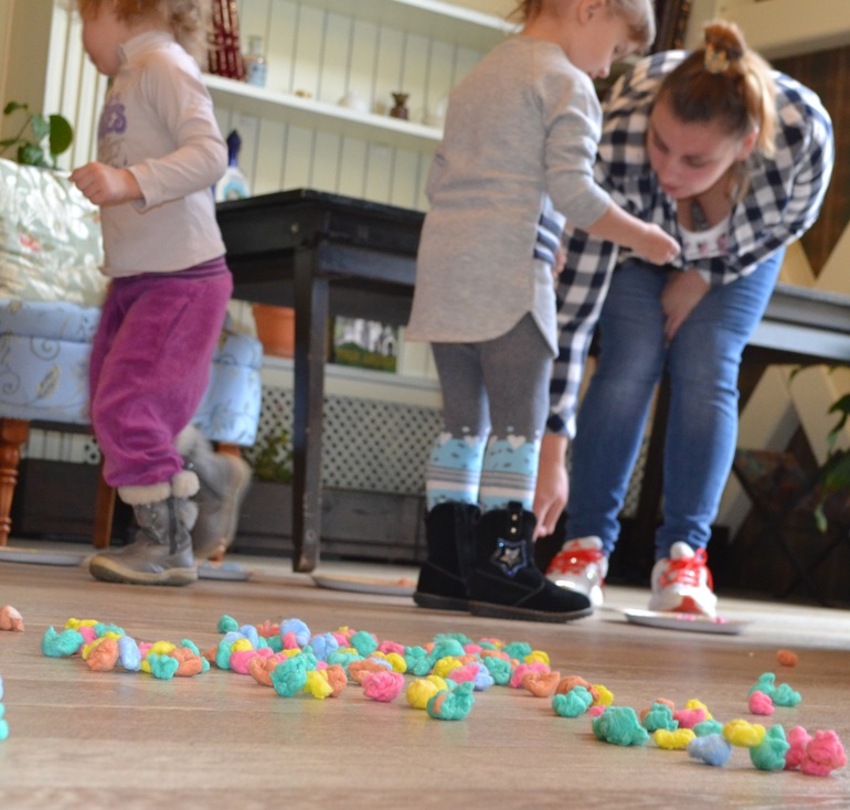 Дорожку я сделала из длинного куска обоев и с помощью шаблона лисьего следа нарисовала следы, чтобы детки прыгали то на одной ножке, то ножки в стороны, то делали широкий шаг. Но я забыла дорожку дома (дырявая голова!), поэтому этот пункт с малышами мы пропустили, хотя я уверена, что им бы понравилось. Но мы остались за столом, чтобы приготовить...