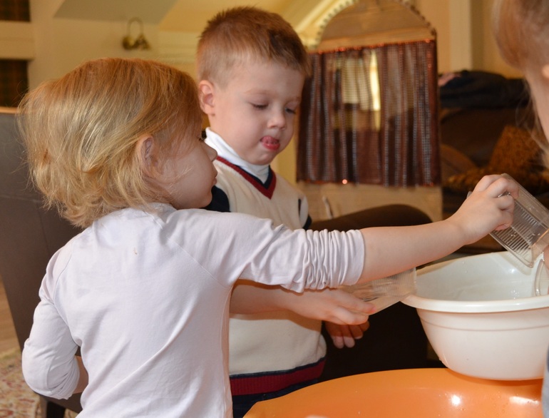 Дальше мы переместились к емкости, в которой были ледяные домики, размером с екеевские формочки для кексов. С помощью теплой воды и соли детки растопили эти домика. И хитрая лисичка оставшись без домика тут же поселилась в заюшкином.