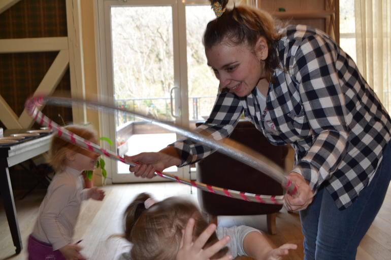 Первым зайчик встретил собаку, которая согласилась помочь прогнать лису, только сначала захотела поиграть в догонялки. Чтобы было интереснее задействовали обруч, и я пыталась ловить разбегающихся малышей им. Веселая переменка получилась :-)