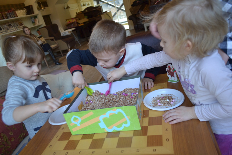 Медведь зайчику тоже не помог, и тогда он отправился к петушку, который с радостью согласился выгнать лису, только попросил сначала накормить его. В коробочке с крупами (гречка, пшено, чечевица) спрятались бусинки (можно заменить детальками Лего), с помощью ложек детки доставали эти детальки в свои мисочки, стараясь не набирать лишнюю крупу.