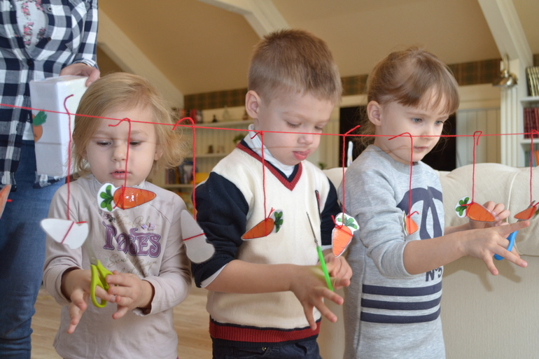 Зайка, конечно, очень расстроился и начал плакать, но на помощь пришли аппетитные угощения! По фото все видно: срезаем ниточки с морковками и кладем их в коробочку с изображением зайчика. В коробке прорезь небольшая, чтобы морковочки приходилось чуть проталкивать. Я распечатала морковки на плотной чертежной бумаге и заламенировала скотчем.