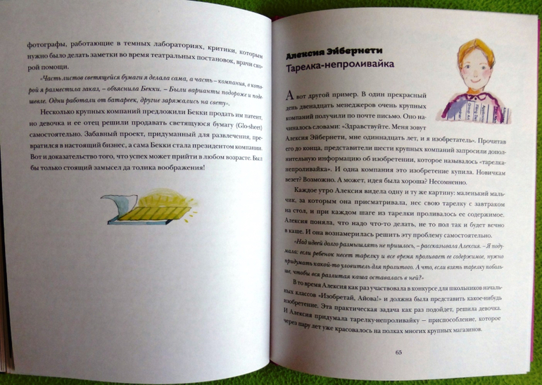 Каждое утро одиннадцатилетняя Алексия видела одну и ту же картину: маленький мальчик, за которым она присматривала, нес свою тарелку с кашей и проливал ее на пол. Алексия захотела решить эту проблему. «Я подумала: если ребенок все время проливает кашу, нужно придумать какой-то уловитель для пролитого. А что, если взять тарелку побольше, чтобы вся разлитая каша оставалась в ней?» И Алексия придумала тарелку-непроливайку.
