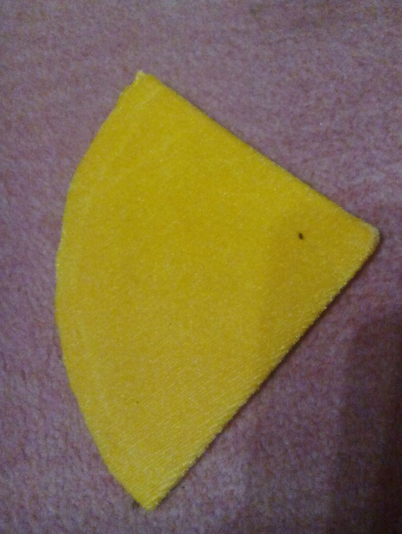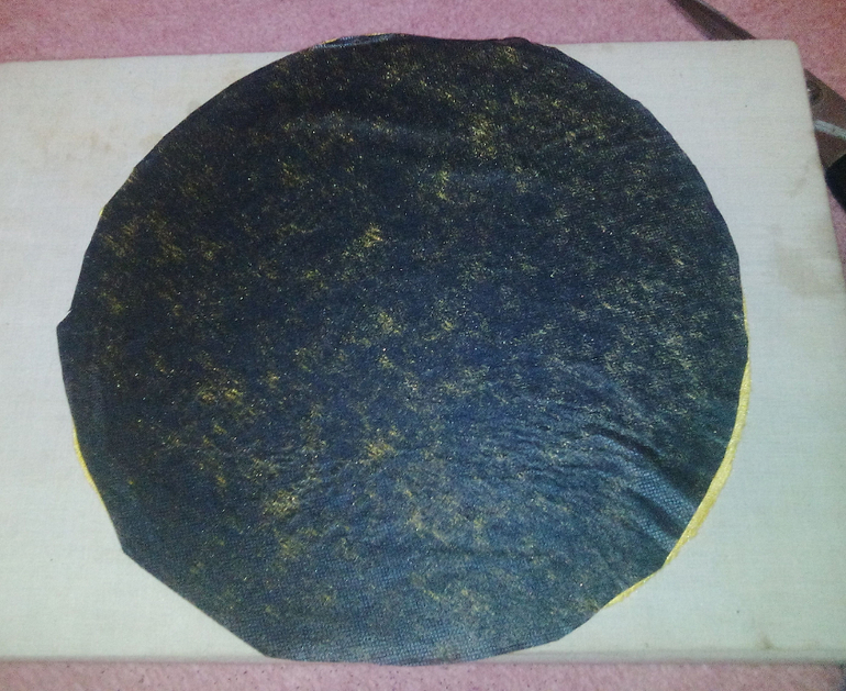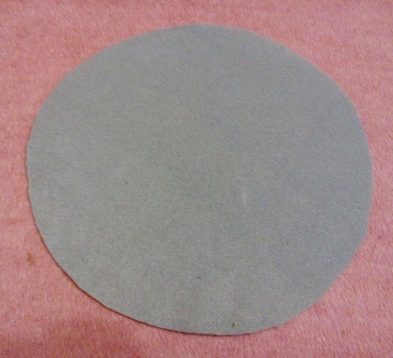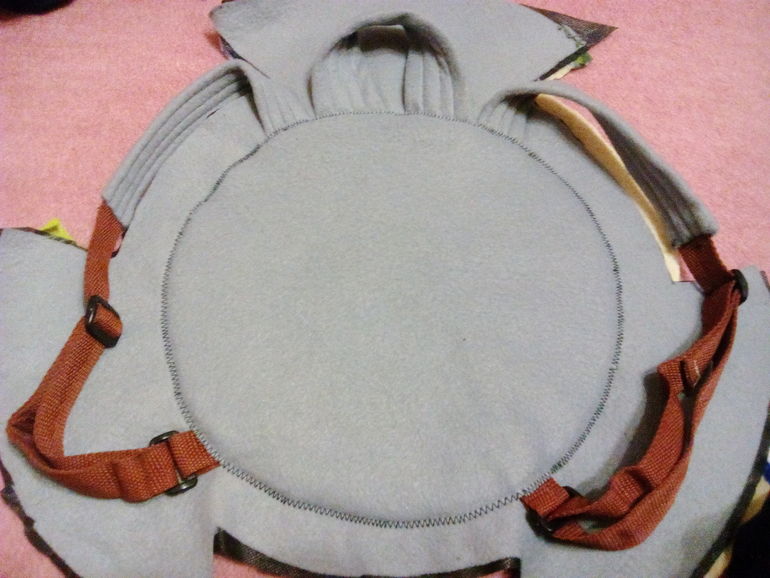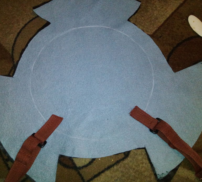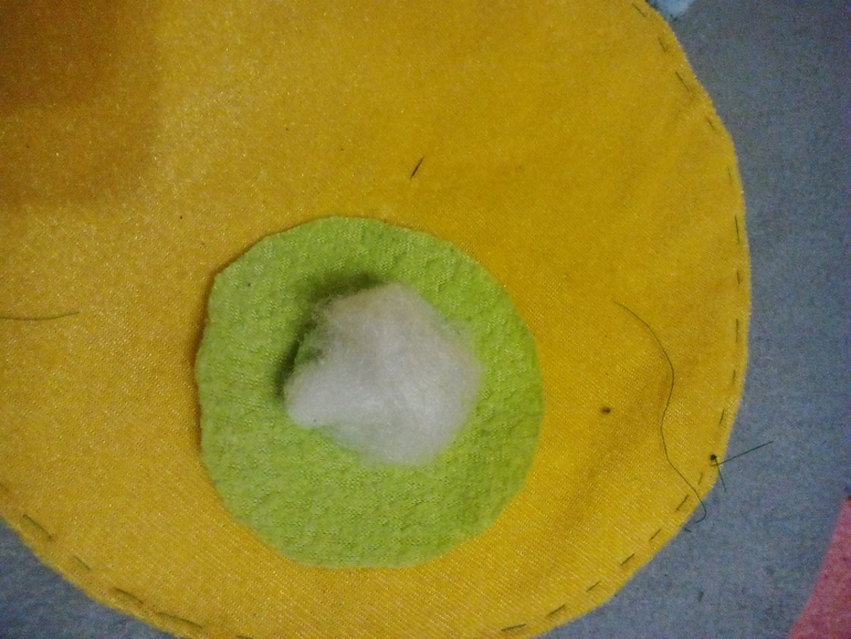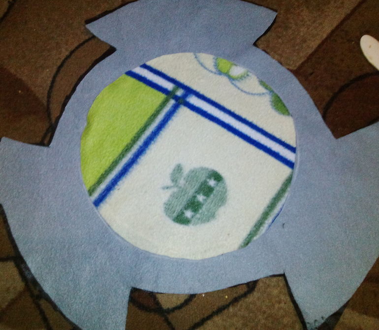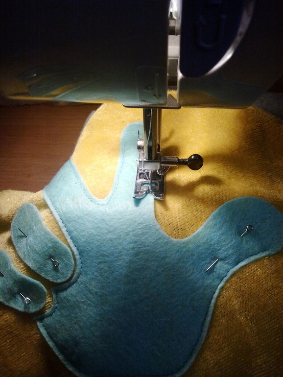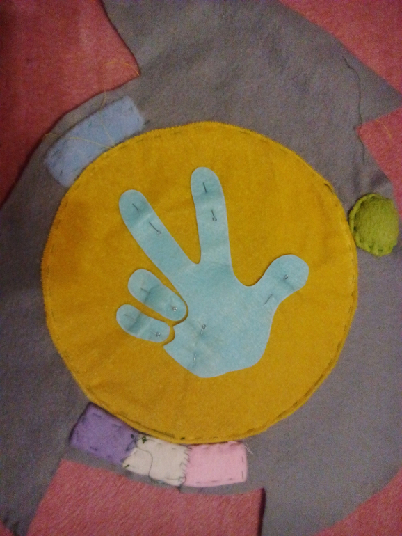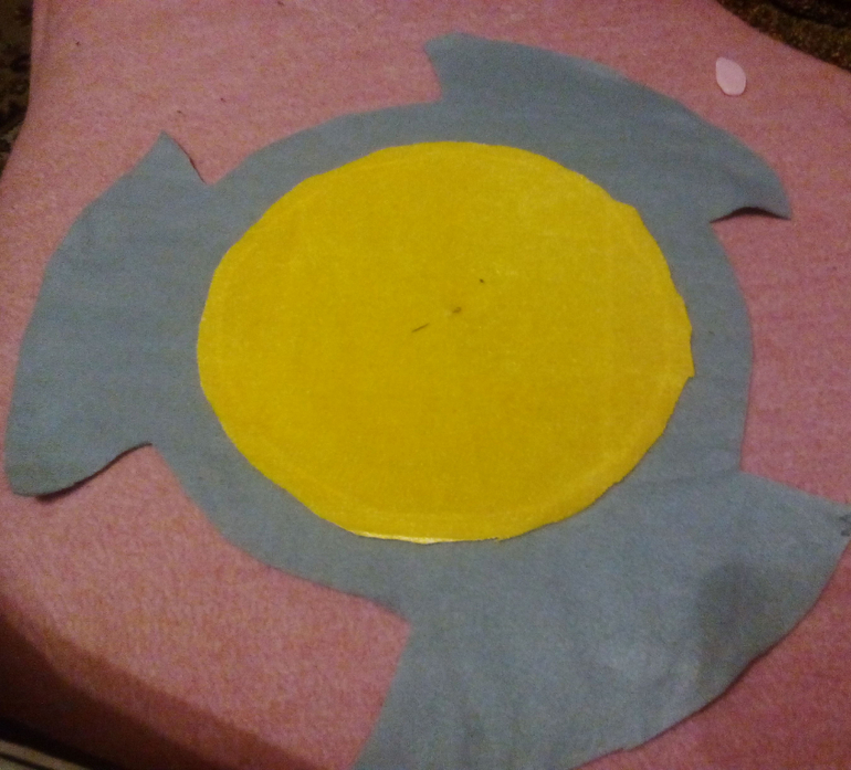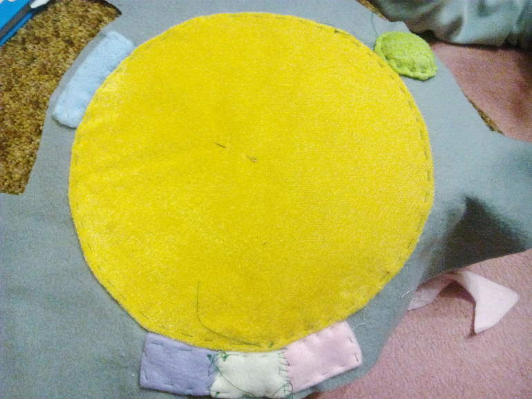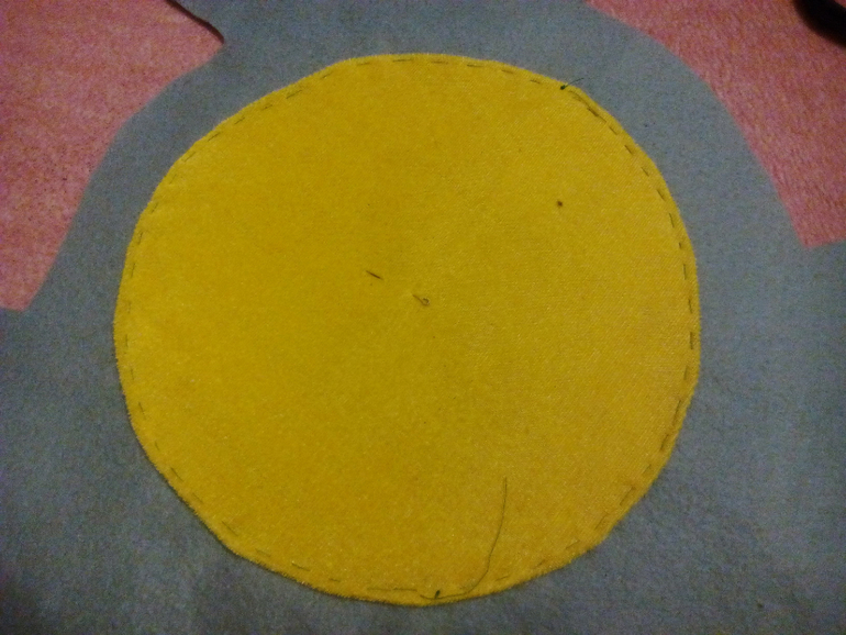 Приметываем желтый круг (либо скалываем булавками). Так как он у меня не из флиса, то края пришлось подворачивать. Для флисовой детали края подворачивать не надо.