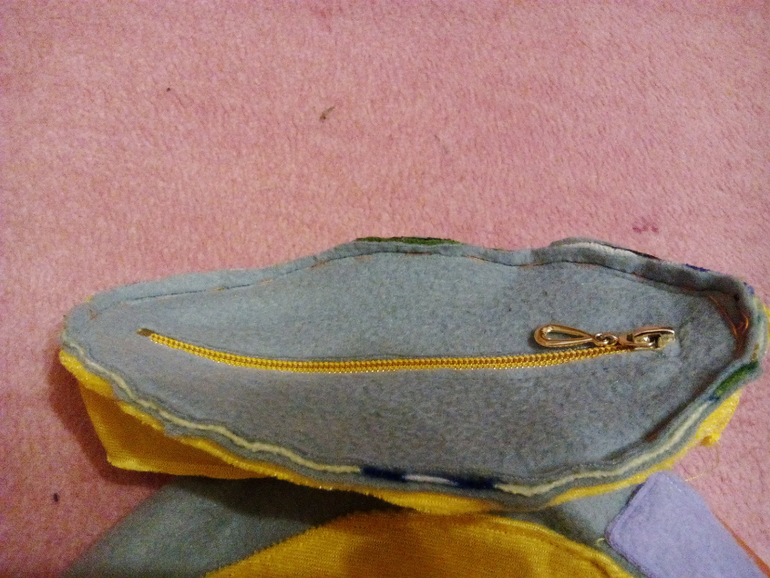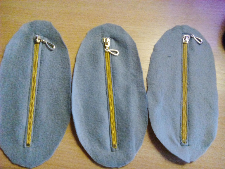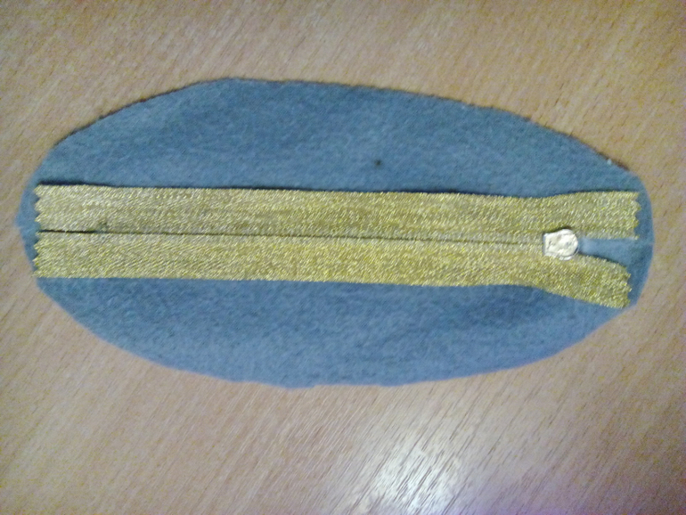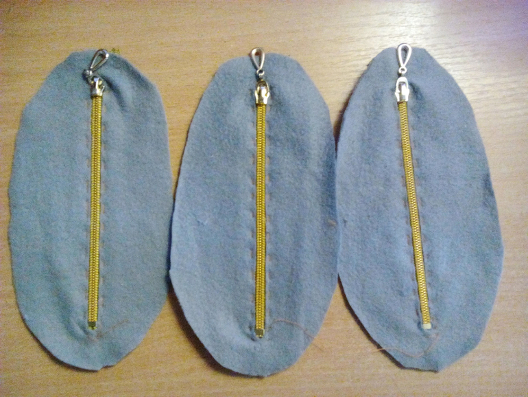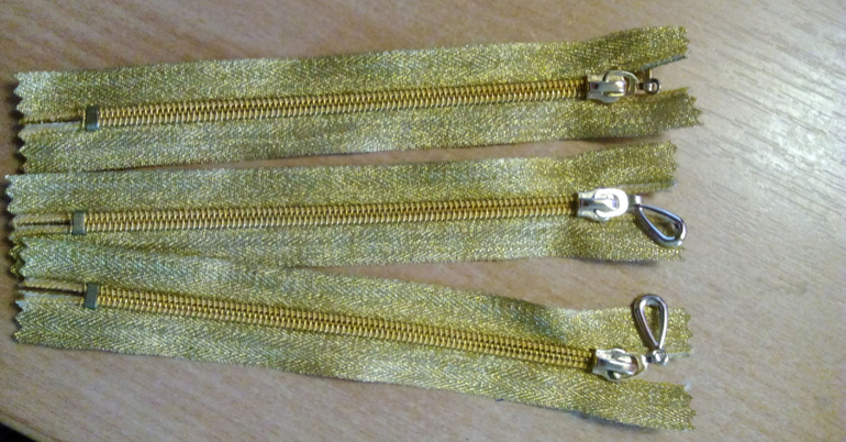 Берем три молнии. Я купила золотистые (ребенок выбрал) по 18 см. Лучше брать такого же цвета, как и отделка (в моем случае желтые).
