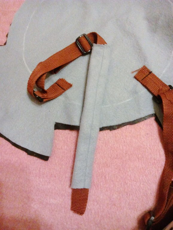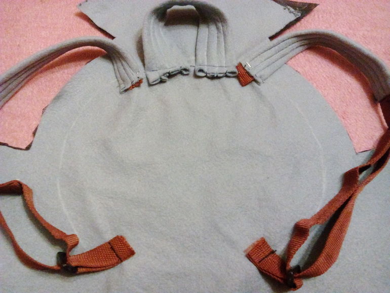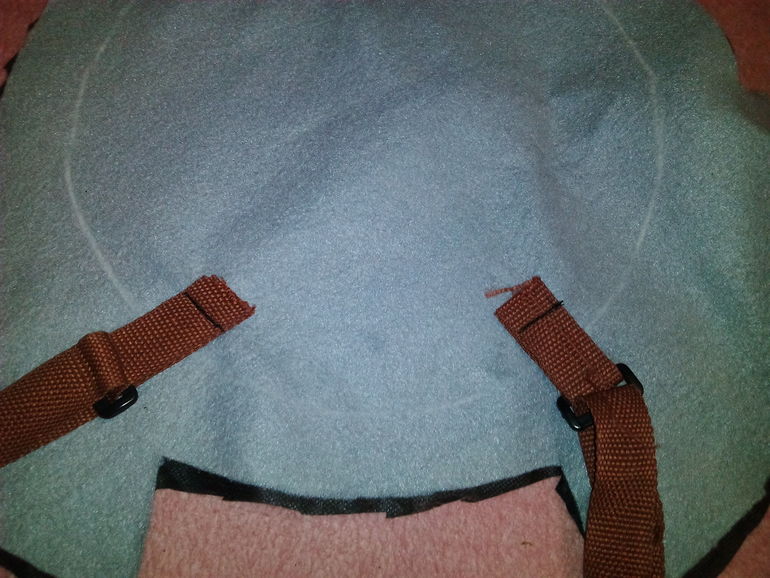 Продеваем стропы в сшитые нами лямки. Края флисовых лямок, которые находятся внизу, подворачиваем, сами лямки тоже прострачиваем по длине несколько раз прям по стропе, тем самым укрепляя их.