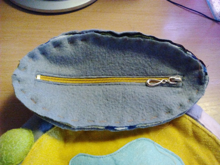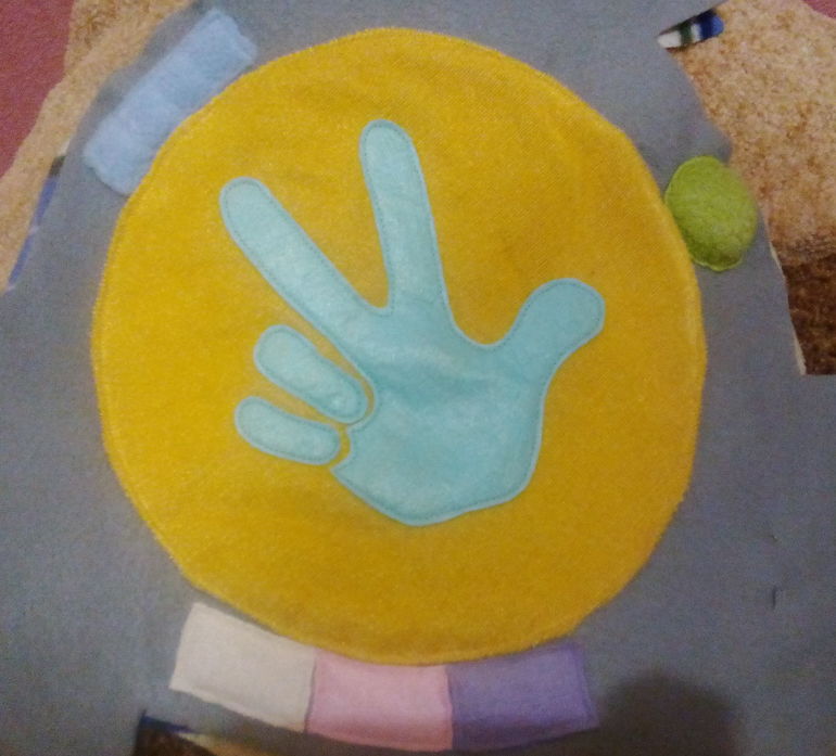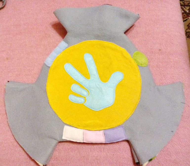 Передняя часть помогатора готова. Стачивать все детали лучше через весь наш бутерброд из ткани ( деталь 1 из подкладочной + деталь 1 из основной + деталь 2 желтый круг + рука из фетра).