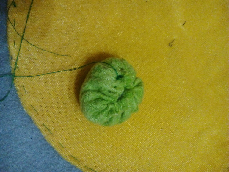 Делаем кнопки. Для зеленой на небольшой кружок из ткани кладем кусочек синтепона.