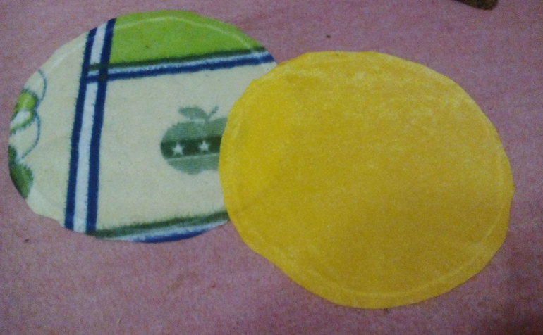 Складываем детали, совмещая центры. Сверху желтый круг (деталь2), под ним деталь 1 из основной ткани. На фотографии у меня нет, но лучше сразу положить и деталь 1 из подкладочной ткани под самый низ.