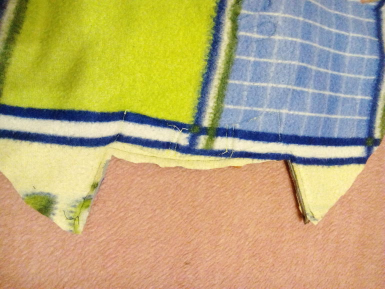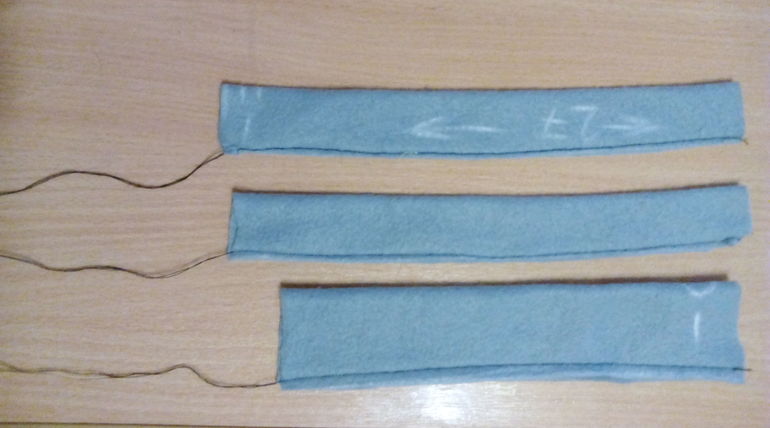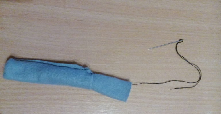 В принципе флисовые детали и так легко выворачиваются, но если возникнут трудности, то пригодится эта длинная нить. Продеваем ее в иголку, а иглу протягиваем через деталь. Вуаля - деталь вывернута. Этот способ хорош для выворачивания всех длинных и узких деталей.