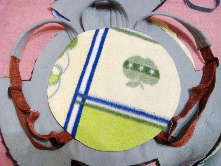 Проклеила флизелином для прочности. Если есть дублерин - еще лучше. Для передней части рюкзака я проклеила только желтый круг, но можно это сделать и со всеми деталями.