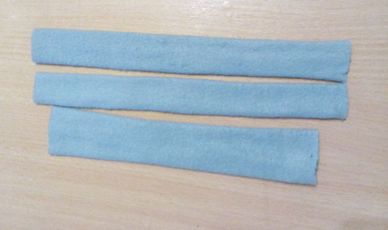 Выкриваем деталь 2. По одной детали из основной ткани, подкладочной и из ткани для отделки. Для отделки флиса у меня не нашлось, использовала какой-то стрейч-велюр (не знаю правильное название ткани). Эта ткань не очень удобна, так как она крутится, края осыпаются. Если есть возможность, то лучше использовать флис.