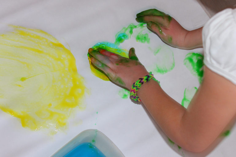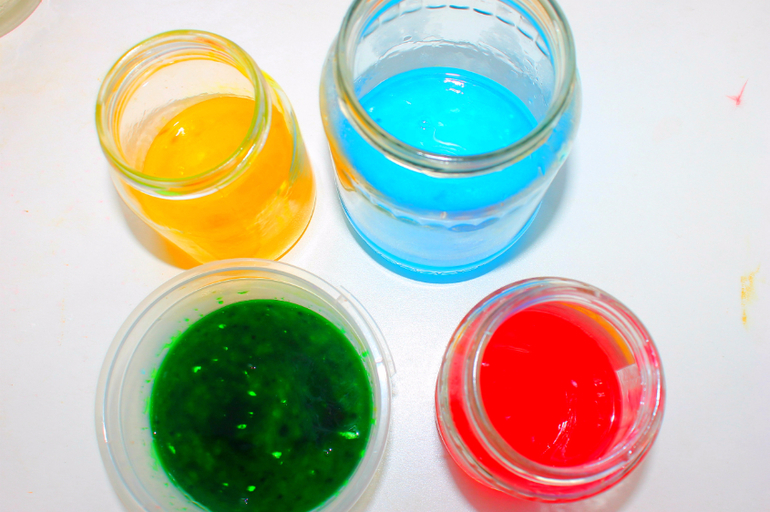 Понадобится крахмал,вода и красители. Я поставила в небольшой кастрюльке воду, нагрела ее и понемногу добавляла крахмал постоянно помешивая (чуть меньше 100 гр), довести до кипения и процедить (можно и не процеживать,если вам удастся сварить такой "кисель" без комочков,у меня не вышло). И разлить по ёмкостям с красителями, размешать хорошенько и дать остыть. Остывает быстро))))