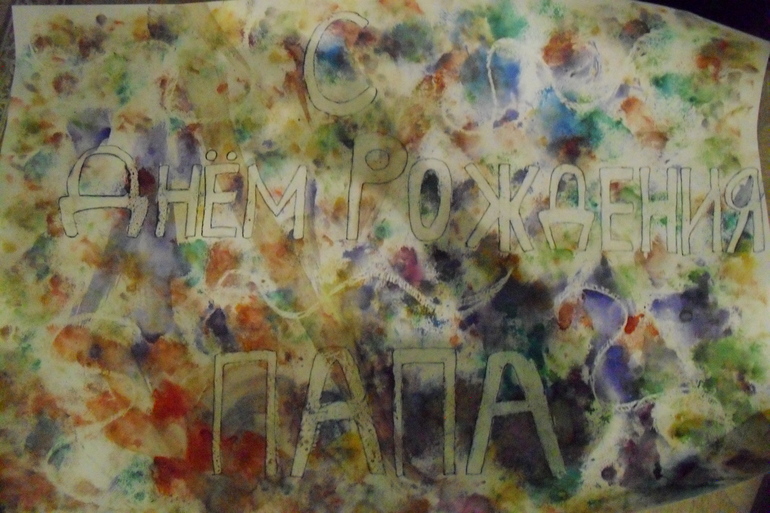 Школа дошколят (все о изучении букв, цифр, развитии логики, памяти, воображения, мышления)Давно не писала, потому что мы болеем, вначале Аринка потом я. Не стала я делать мужу поздравление, которое хотела. Ни оказалось у меня желания и сил. Вообщем вчера стало мне получше и решила, что хватит нам бездельничать надо время с умом проводить))) Пока Арина днем спала сходила в магазин( я так оооочень редко делаю) купила ватман, мужу розочку( 7 лет уже просит, чтоб цветы подарила, вообщем дождался) и пирожные картошка, ну и ребенку верблюжонка, раз мы его изучаем. Доча проснулась увидела верблюжонка, но ни какого восторга он на неё не произвел, вообщем вначале отложили. Начали рисовать папе плакат. Пока она спала я написала поздравление и обвела его обычной свечой. Дала Арине в руки краски, кисточку и губку. Арина набирала краски кисточкой и раскрашивала губку, потом ставила отпечатки на бумагу. Так как буквы намазаны парафином, то они не закрашиваются))) Вообщем ребенок был предоставлен сам себе, а я пока убиралась. В конце я только обвела буквы. Вот что получилось.
