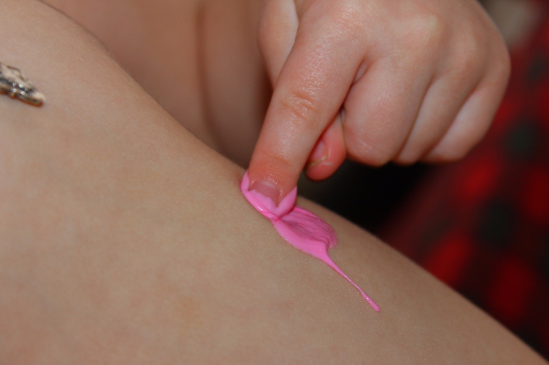 Рецепт очень похож на неньютоновскую жидкость, но наносим краску всё же на тело,а потому ингредиенты были следующие: крем (можно детский,можно для тела), тоник для лица (или вода), детский шампунь и крахмал для вязкости. Пропорции примерно следующие- на 100 гр крахмала, 80-100 гр крема, вполовину меньше шампуня и тоника (или воды) добавляем до нежной консистенции крема. Красители добавляла уже в менажнице,размешивая палочкой. Получилась красотища.