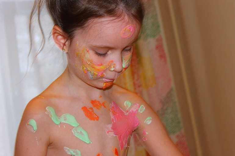 Началось всё скромно, одним пальчиком, да на щечке. "Мама,а можно на животике?!"- "Можно,дочка!". "Мам, а я хочу на ножке!"- "Рисуй, сынок,рисуй!"
