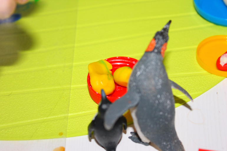 При лепке лакомства животным используем детские пальчики по-максимуму. Катаем яблочко для лошадки, отщипываем травку для бегемота, катаем "колбаски" бамбука для панды и т.д.