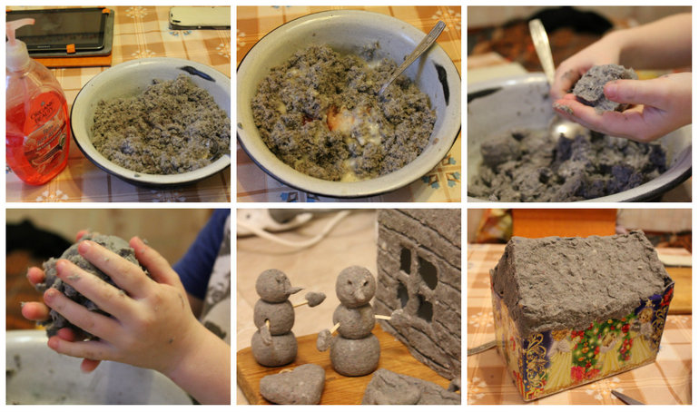 Теперь дом высохнет ( сегодня утром, т.е. спустя 12 часов еще не досох) дальше можно будет штукатурить, шкурить, разукрашивать и вообще делать,что угодно. Из такой массы можно сделать мебель куклам, еду, развивающие пособия, цветы, да много чего. мы еще лепили снеговиков, сделали лодочку, сердечки к 14 февраля