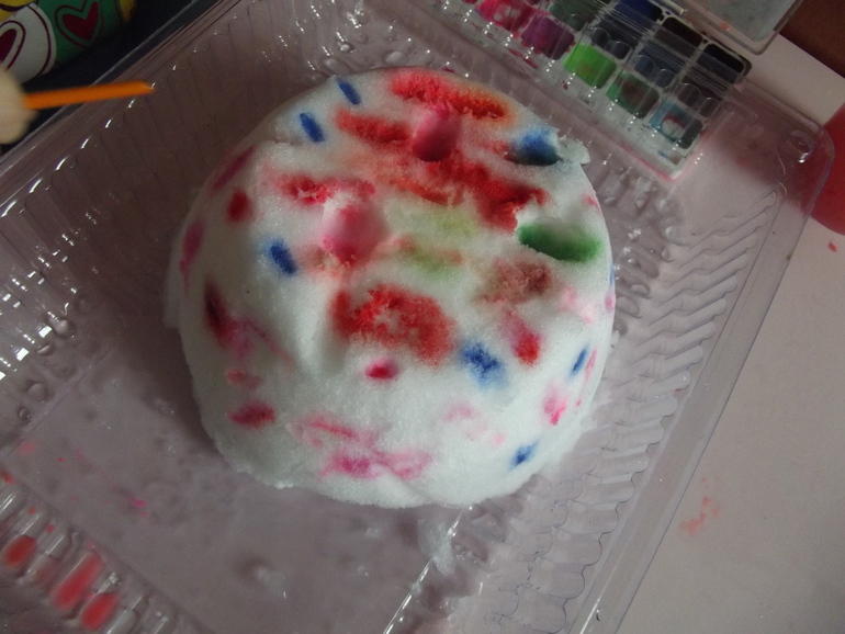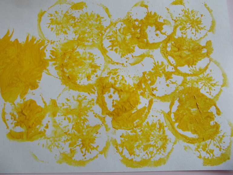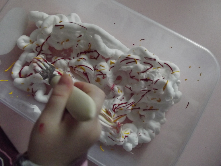 Рисовали разными необычными способами . Например вилкой на пене для бритья .