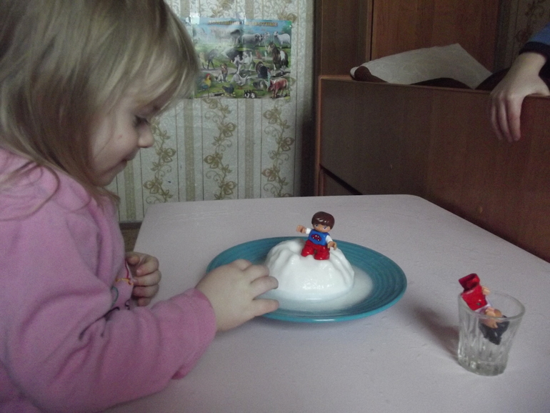 Соду смешать с водой до состояния жидкой сметаны и заморозить . Готовый вулкан полить раствором воды и лимонной кислоты и он начнет действовать .