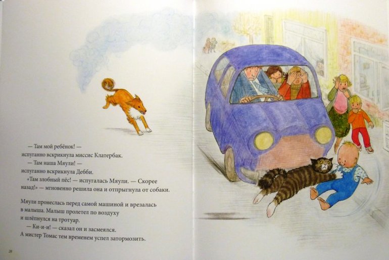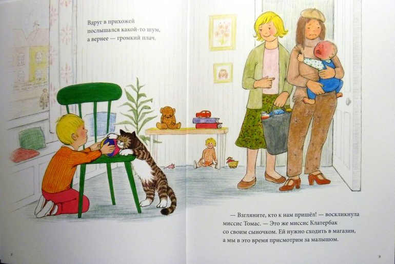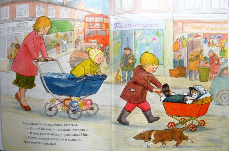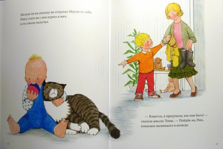 В данном случае история преподносится немного с другой стороны. В дом ненадолго принесли малыша. И вот этот малыш стал ходить просто по пятам Мяули. А мальчик Ник заскучал. Но мама предложила покатать малыша в коляске. Тогда Ник решил катать в коляске Мяули.