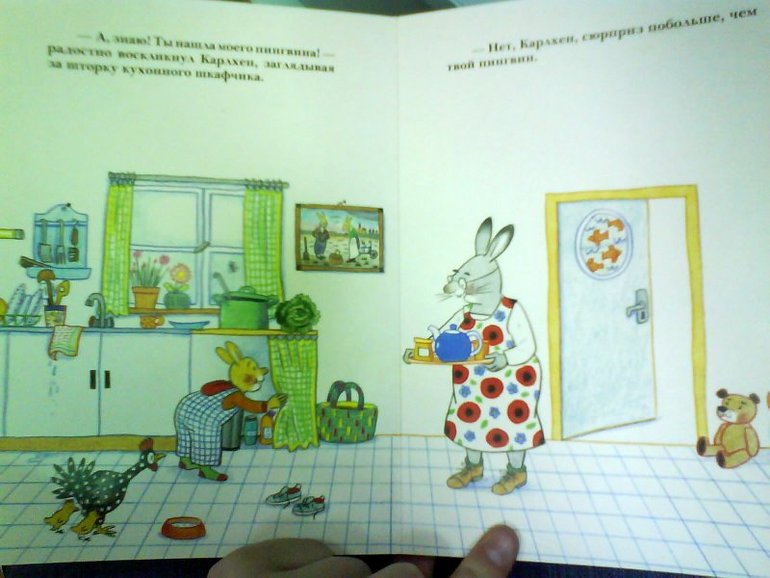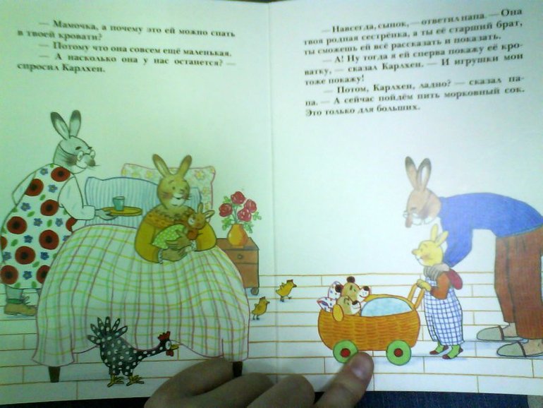 Приходит Карлхен домой, а там...сюрприз. Что же это гадает кролик и в конце понимает, что у него появилась маленькая сестричка.